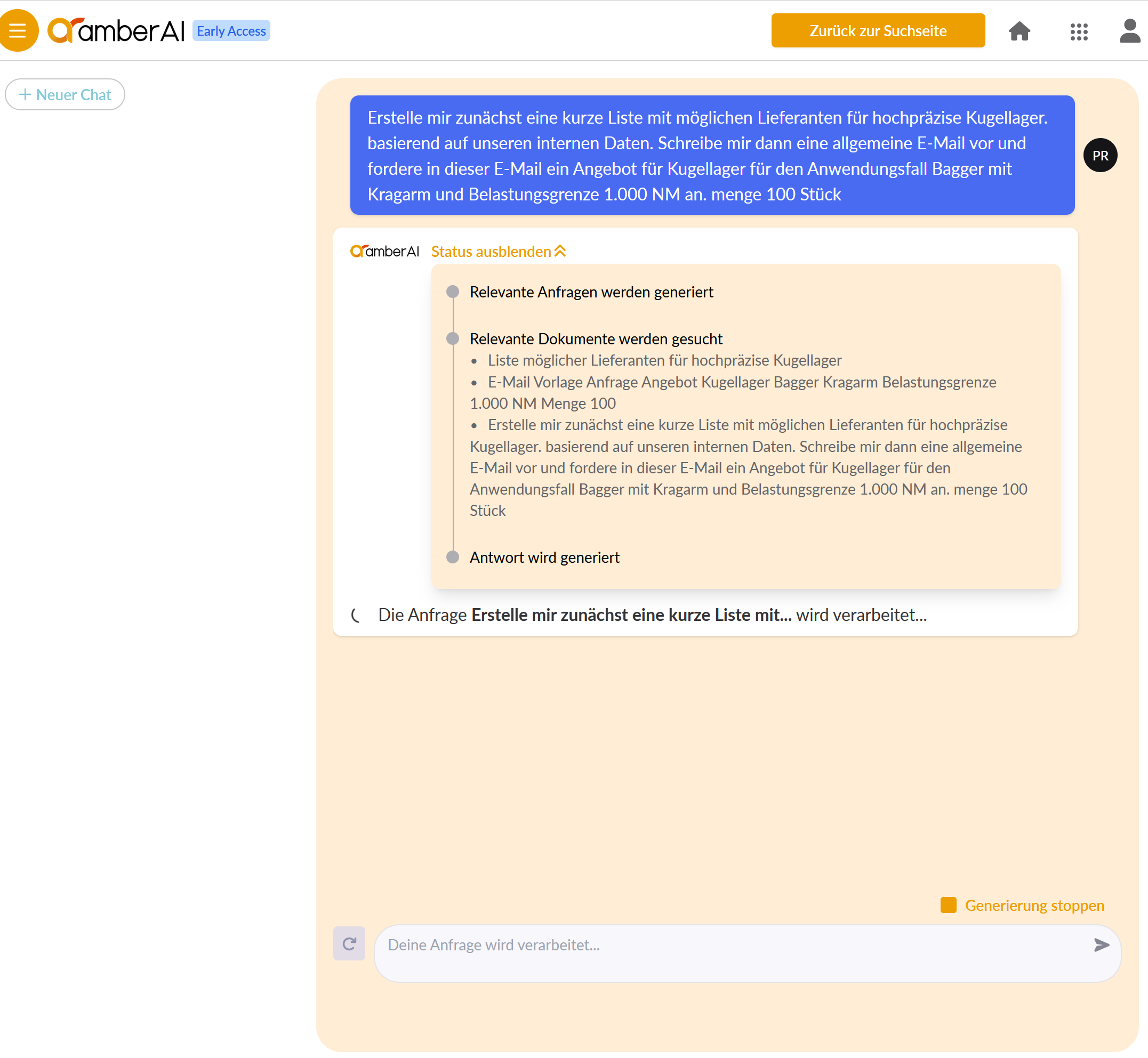 The AI analyzes the request and sends up to 10 resulting search queries to the system in the background. All information is then aggregated and the actions requested by the user are carried out.